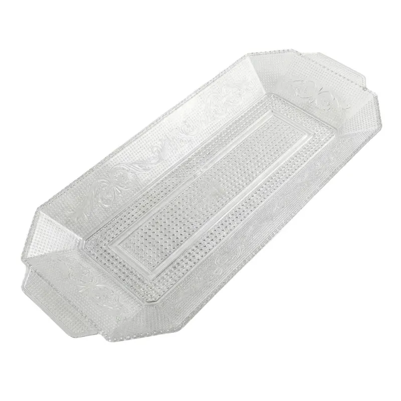 Bandeja Lux Rectangular de plástico transparente reutilizable de 37 x 14,5 cm. Fabricada en poliestireno alimentario. Perfecta para presentación de todo tipo de alimentos, tartas, dulces, salados, carnes, pescados, etc. Dale un toque de glamour a tu mesa.