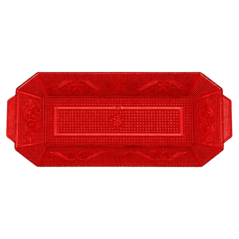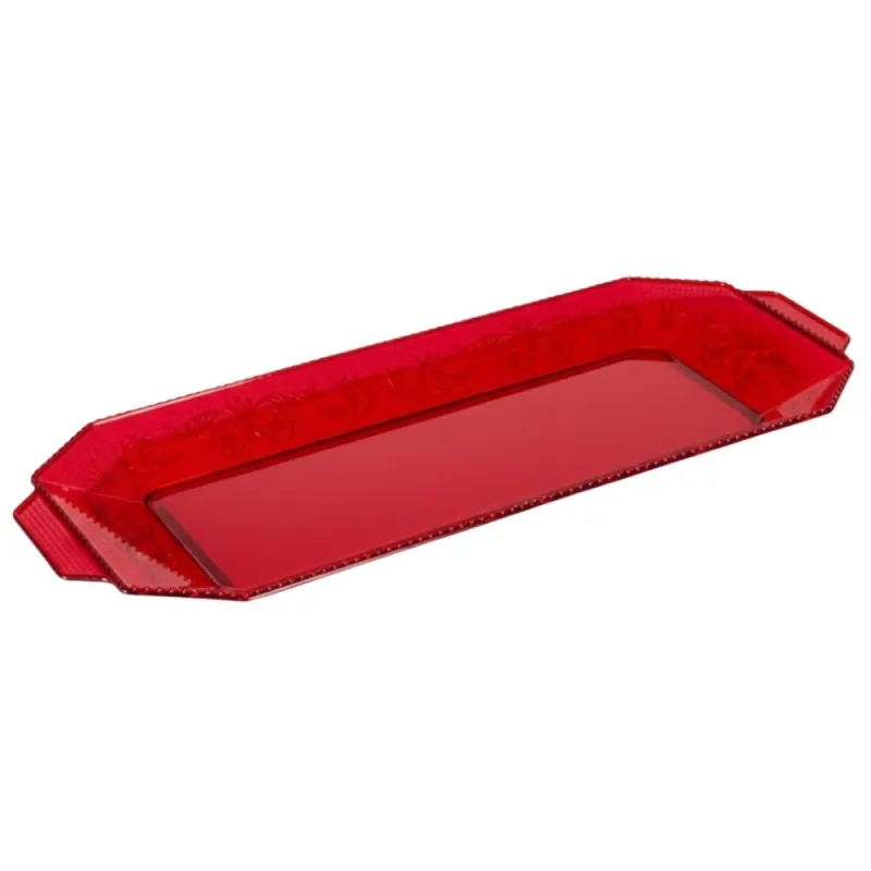 Bandeja Lux Rectangular de plástico Rojo Translúcido reutilizable de 37 x 14,5cm. Fabricada en poliestireno alimentario. Perfecta para presentación de todo tipo de alimentos, tartas, dulces, salados, carnes, pescados, etc. Dale un toque de glamour a tu mesa.