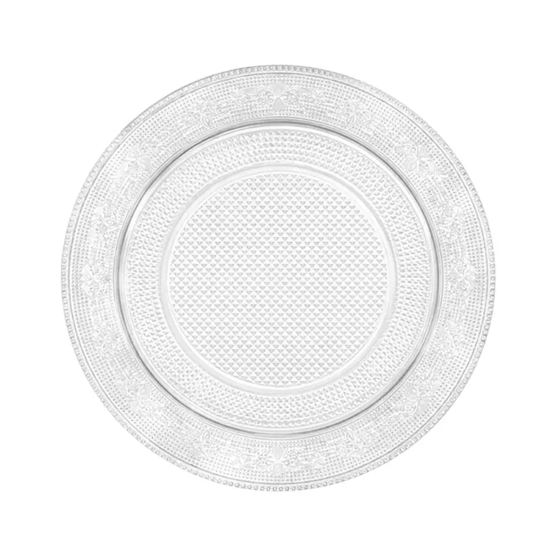 Bandeja Lux Redonda de plástico transparente reutilizable de 20cm. Fabricada en poliestireno alimentario. Perfecta para presentación de todo tipo de alimentos, tartas, dulces, salados, carnes, pescados, etc. Dale un toque de glamour a tu mesa.