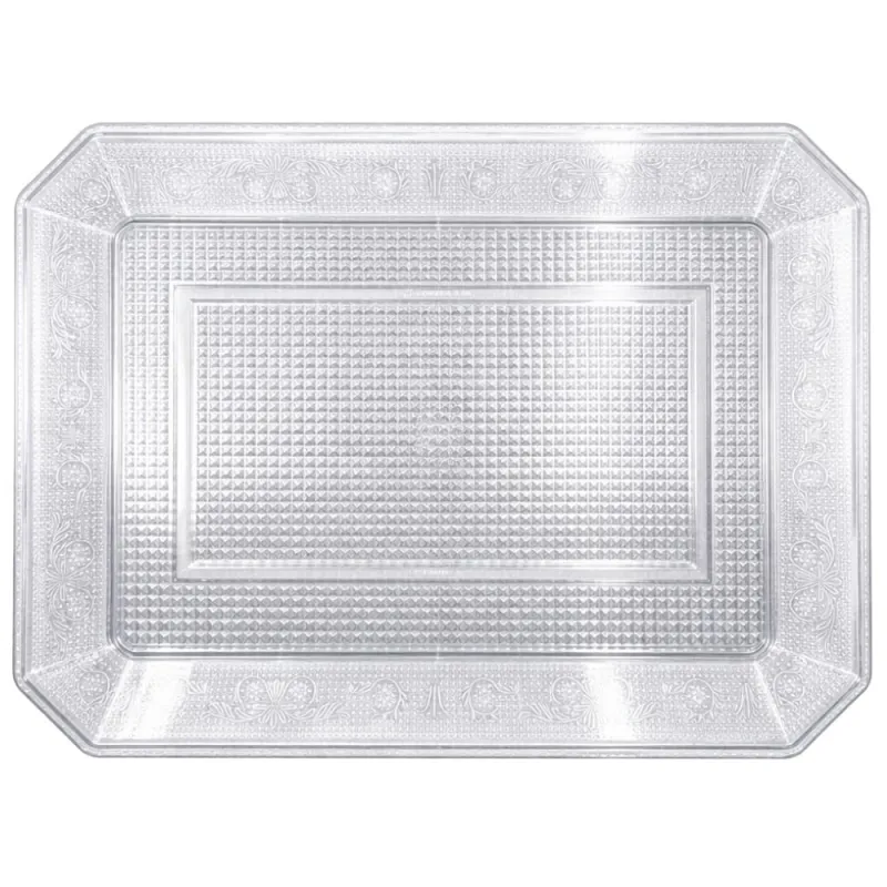 Bandeja Lux Rectangular de plástico transparente reutilizable de 35 x 25cm. Fabricada en poliestireno alimentario. Perfecta para presentación de todo tipo de alimentos, tartas, dulces, salados, carnes, pescados, etc. Dale un toque de glamour a tu mesa.