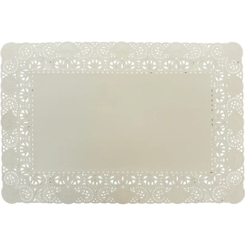 Blondas de papel caladas de 25x37 cm en color blanco roto, ideales para presentar pasteles, postres y alimentos con un acabado más elegante y profesional. Su diseño rectangular con borde troquelado realza la presentación y se adapta a bandejas y platos, mejorando la apariencia del producto. Además de aportar estética, estas blondas incrementan la higiene al evitar el contacto directo del alimento con la bandeja, protegiéndola y facilitando la limpieza. Fabricadas en papel virgen apto para uso alimentario, estas blondas son higiénicas y 100% biodegradables.