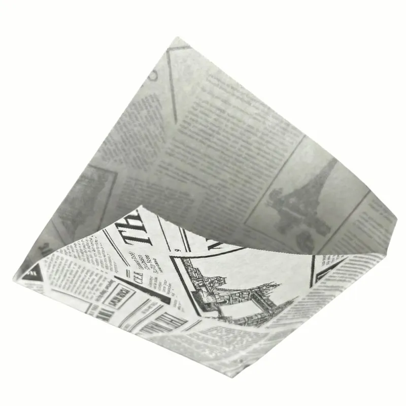 Bolsas de Papel Antigrasa Blancas de 15x15cm con apertura a 2 lados, fabricadas en papel parafinado de 35gr con impresión de periódico.