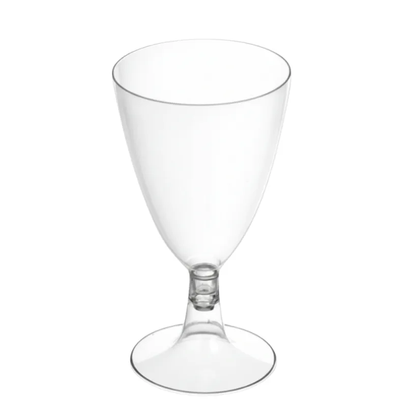 Copas de plástico para vino o agua, transparentes y con capacidad para 220ml. Fabricadas en poliestireno efecto cristal y pie desmontable en color transparente. Unidad de venta en paquetes de 3 unidades y cajas de 144 Uds. Perfectas para celebraciones.