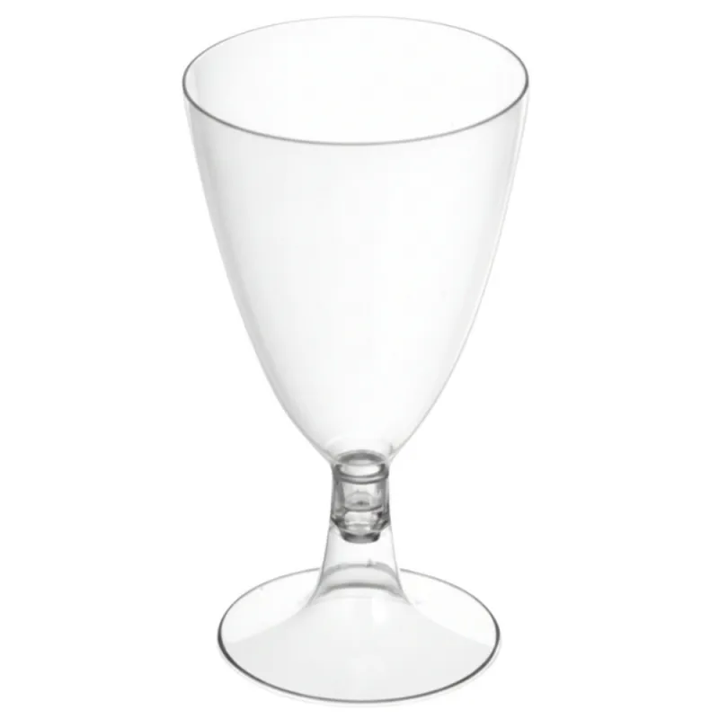Copas de plástico para vino o agua, transparentes y con capacidad para 220ml. Fabricadas en poliestireno efecto cristal y pie desmontable en color transparente. Unidad de venta en paquetes de 3 unidades y cajas de 144 Uds. Perfectas para celebraciones.