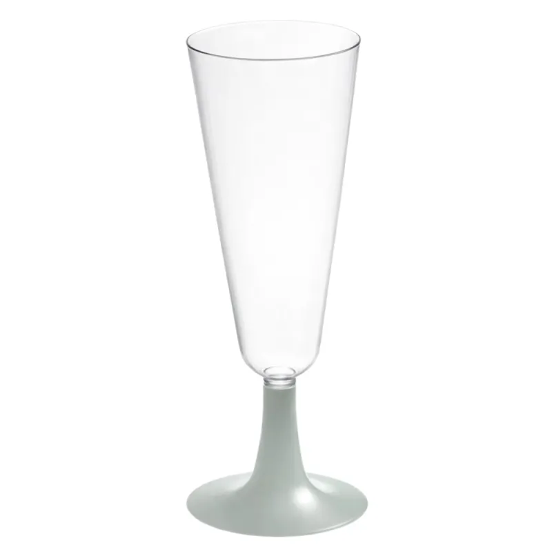 Copas de cava de plástico transparente y pie plata con capacidad para 150ml. Fabricadas en poliestireno efecto cristal y pie desmontable en color plata.