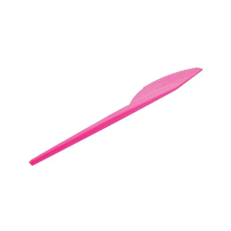 Cuchillos de plástico rosas de 16,5 cm. Fabricados en poliestireno alimentario. Unidad de venta en paquetes de 15 unidades o cajas de 540 Uds. distribuidas en 36 paquetes de 15 unidades.