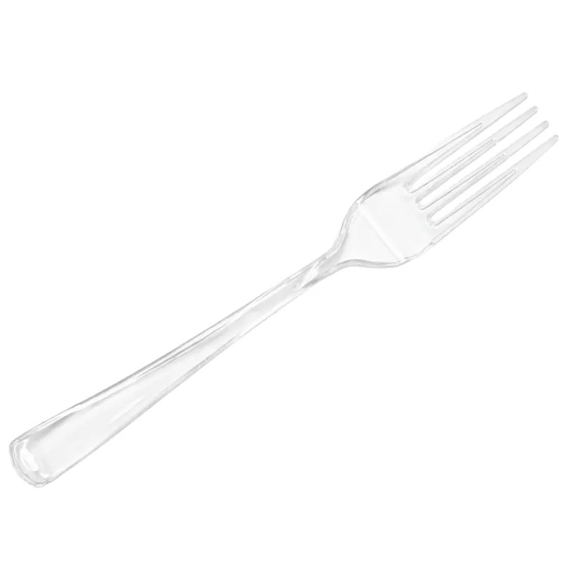 Tenedores de plástico transparentes de 18,5 cm reutilizables para 25 lavados. Fabricados en poliestireno alimentario de gran calidad y rigidez. Unidad de venta en paquetes de 12 unidades, 100 Uds. o cajas de 1.000 Uds distribuidas en 10 paquetes de 100 unidades.