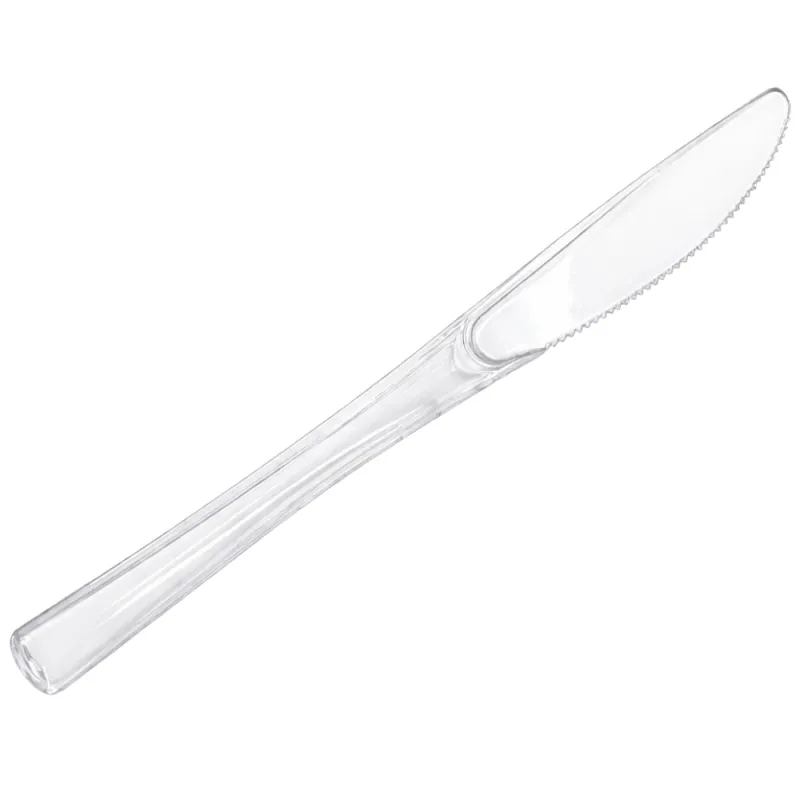 Cuchillos de plástico transparentes de 20 cm reutilizables para 25 lavados. Fabricados en poliestireno alimentario de gran calidad y rigidez. Unidad de venta en paquetes de 12 unidades, 100 Uds. o cajas de 1.000 Uds distribuidas en 10 paquetes de 100 unidades.