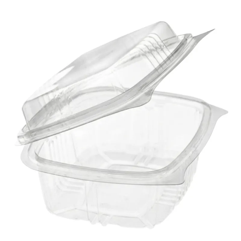 Envases de plástico PET transparentes con tapa alta plana, una solución ideal para almacenar, transportar y presentar alimentos frescos y preparados. Hechos de plástico PET de alta calidad, destacan por su resistencia, ligereza y excelente transparencia. La tapa con bisagra integrada asegura un cierre hermético, perfecto y también proporciona 200cc adicionales, aumentando la capacidad total del envase a 700cc. Permite preservar la calidad de los alimentos y evitar derrames o fugas. Gracias a su completa transparencia, los alimentos son fácilmente visibles.