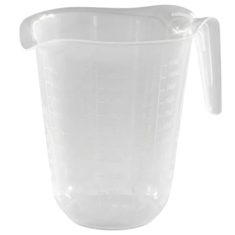 Jarra medidora de plástico PP (polipropileno) versátil y práctica, ideal para medir tanto líquidos como alimentos sólidos como azúcar, arroz, harina, entre otros. Sus guías de llenado detalladas y fáciles de leer, permiten obtener mediciones en todo momento, garantizando precisión y facilidad de uso. Con una capacidad máxima de 1 litro, es perfecta para tareas cotidianas en la cocina, tanto en el hogar como en establecimientos de hostelería, como restaurantes, cafeterías o bares, donde la rapidez y precisión en la medición de ingredientes son esenciales.