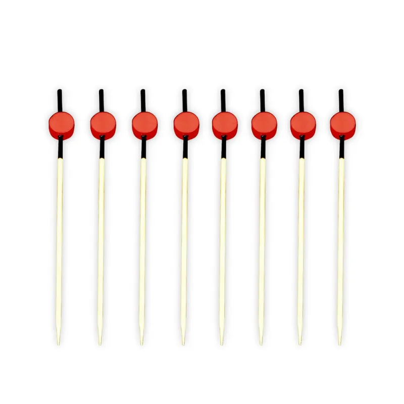Estps pinchos de bambú en negro y rojo son el accesorio perfecto para realzar la presentación de tapas, brochetas, pinchos y aperitivos gourmet. Su diseño decorativo en negro y rojo aporta un toque de distinción y elegancia a cualquier evento o servicio de catering, convirtiéndose en la opción ideal para restaurantes, bodas, fiestas, eventos y bares de tapas.