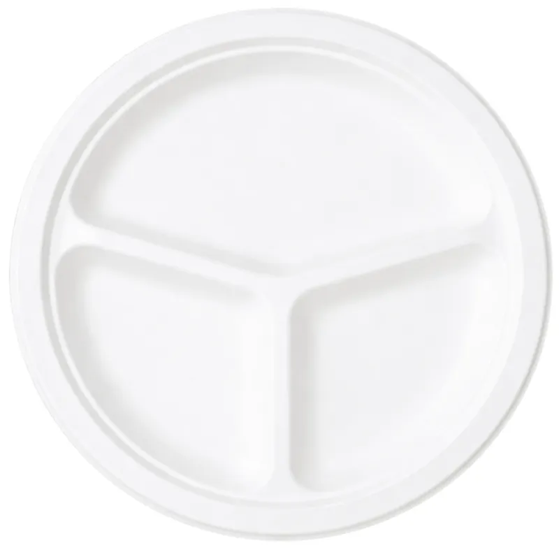 Platos biodegradables redondos con tres compartimentos de caña de azúcar desechables color blanco de 26 cm. Fabricados en caña de azúcar, son compostables y la mejor elección para disfrutar de tus platos desechables ecológicos, respetando el medio ambiente y la naturaleza. Unidad de venta en paquetes de 50 unidades o cajas de 500 unidades. Aptos para microondas.