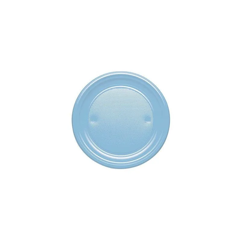 Platos de plástico azul baby desechables de 20,5 cm. Fabricados en poliestireno alimentario. Unidad de venta en paquetes de 10 unidades o cajas de 600 Uds distribuidas en 60 paquetes de 10 unidades.