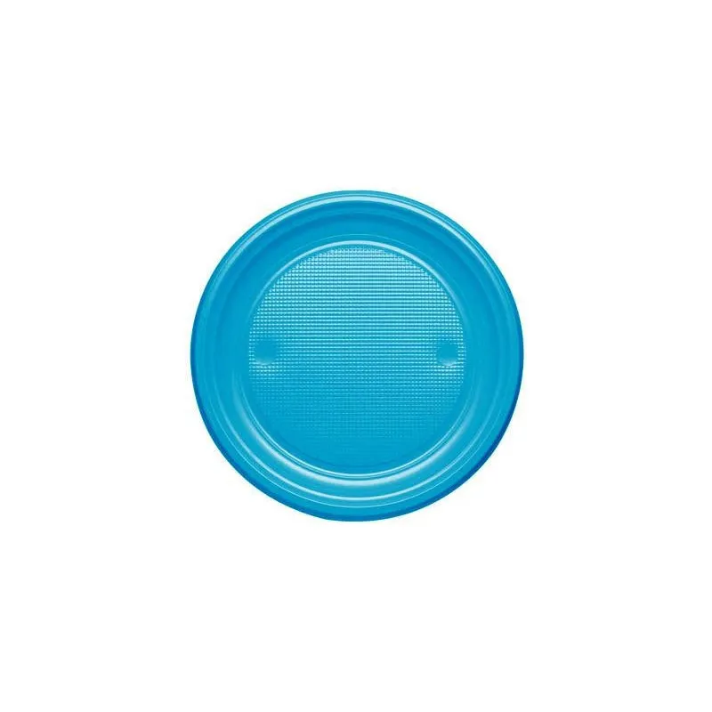 Platos de plástico azul nube desechables de 20,5 cm. Fabricados en poliestireno alimentario. Unidad de venta en paquetes de 10 unidades o cajas de 600 Uds distribuidas en 60 paquetes de 10 unidades.