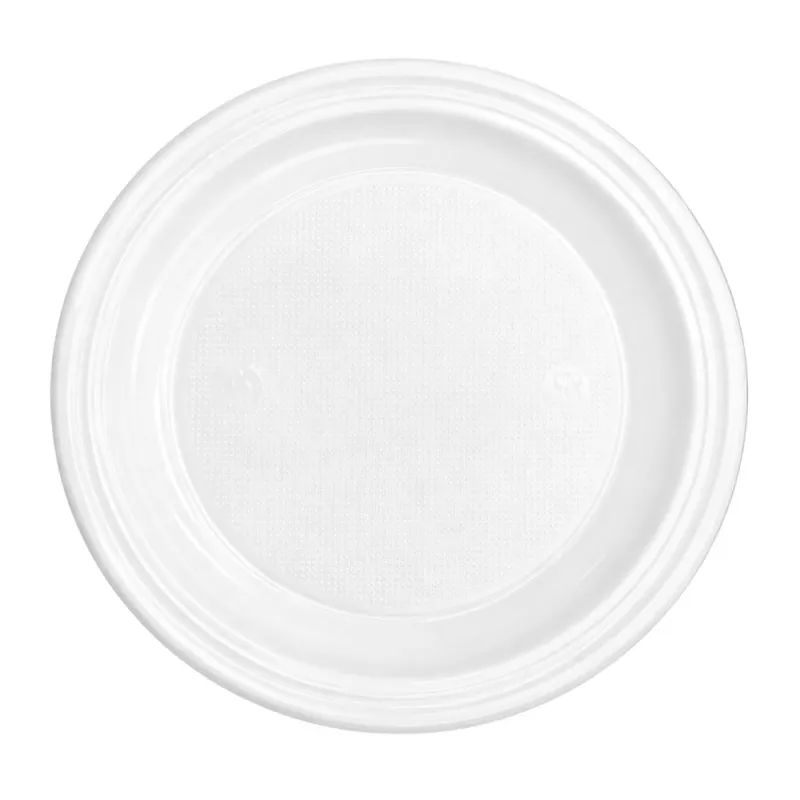 Platos de plástico llano blancos de 20,5 cm. Fabricados en poliestireno alimentario. Unidad de venta en paquetes de 100 unidades o cajas de 1.000 Uds distribuidas en 10 paquetes de 100 unidades.