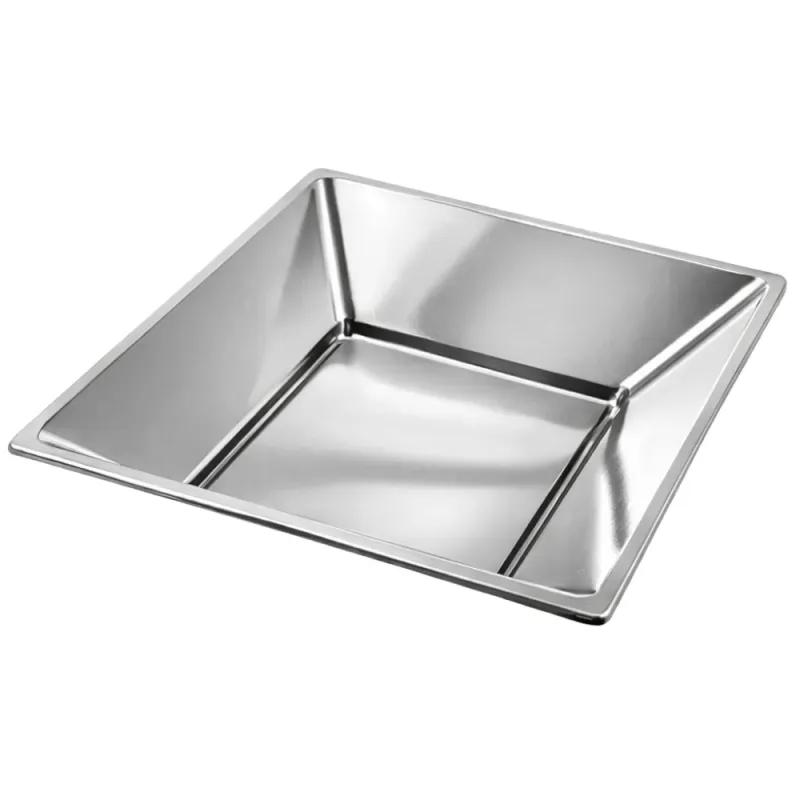 Platos de plástico cuadrados plateados hondos de 17 cm. Fabricados en poliestireno alimentario. Unidad de venta en paquetes de 4 unidades o cajas de 192 Uds distribuidas en 48 paquetes de 4 unidades.