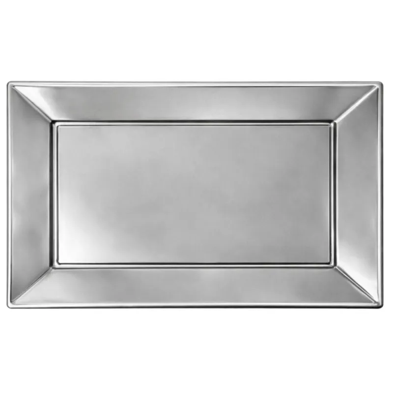 Bandejas de plástico plateadas 33cm x 22,5cm. Fabricadas en poliestireno alimentario. Unidad de venta en paquetes de 2 unidades o cajas de 96 Uds distribuidas en 48 paquetes de 2 unidades.