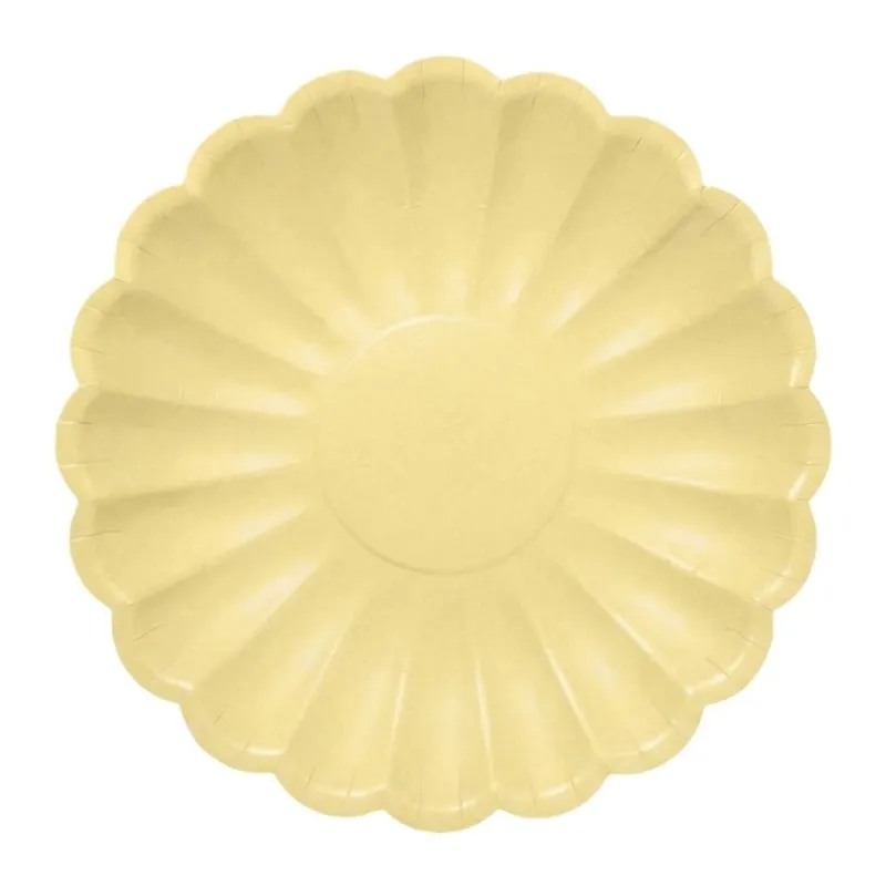 Platos de cartón desechables elegantes con forma floral en color amarillo pastel de 18cm. Estos platos elegantes de papel son ideales para decorar tu fiesta, celebración o cualquier evento y comida donde quieras destacar con originalidad. Unidad de venta en paquetes de 8 unidades.