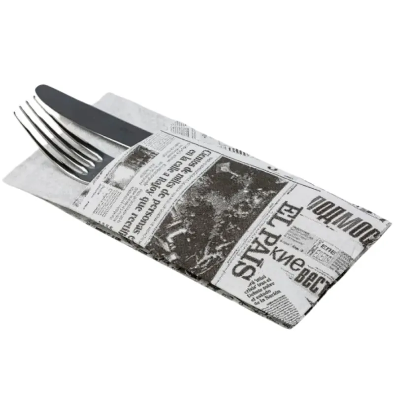 Las servilletas canguro de papel punta-punta diseño News son la opción perfecta para quienes buscan un estilo moderno, original e higiene en sus eventos o negocios de hostelería. También conocidas como servilletas porta-cubiertos, su práctico diseño permite insertar los cubiertos en su interior, logrando una presentación impecable, organizada y elegante. El diseño News, con su estilo de periódico, añade un toque vintage e informal, siendo la elección ideal para restaurantes, bares, cafeterías, catering, locales temáticos y eventos con un estilo retro o urbano.