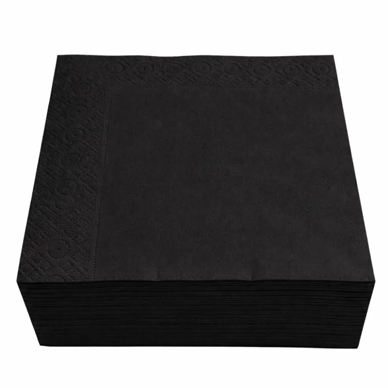 Servilletas Negras de papel Tissue doble capa 33 x 33 cm (16,5 x 16,5 cm plegada), perfectas para Degustaciones, Catering, Fiestas, Restaurantes, etc. Unidad de venta en paquetes de 50 unidades o cajas de 2.400 Uds distribuidas en 48 paquetes de 50 unidades.