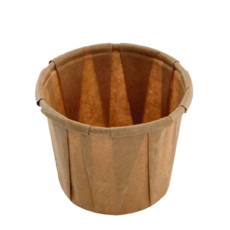 Tarrinas de papel kraft plisado con capacidad de 30 ml, también conocidas como salseras de papel. Están fabricadas con papel alimentario antigrasa, adecuado para el contacto con alimentos. Son ideales para servir salsas, mini postres, aperitivos y pequeñas degustaciones. Prácticas y funcionales para servicios de take away, confitería, repostería, hostelería, panadería y otros negocios de alimentación. Unidad de venta en paquetes de 250 unidades y cajas de 1.000 uds.