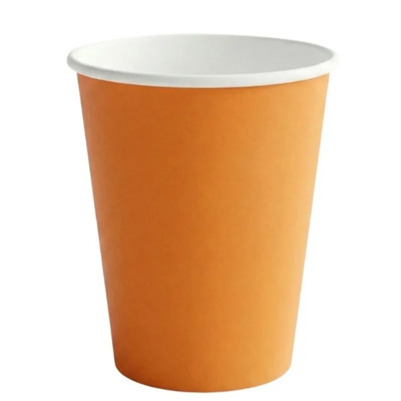 Vasos de cartón naranjas de 260ml de capacidad. Estos vasos de cartón son ideales para decorar tu fiesta, cumpleaños o cualquier evento y comida donde quieras destacar con originalidad. Unidad de venta en paquetes de 10 unidadades o cajas 1.200 uds.