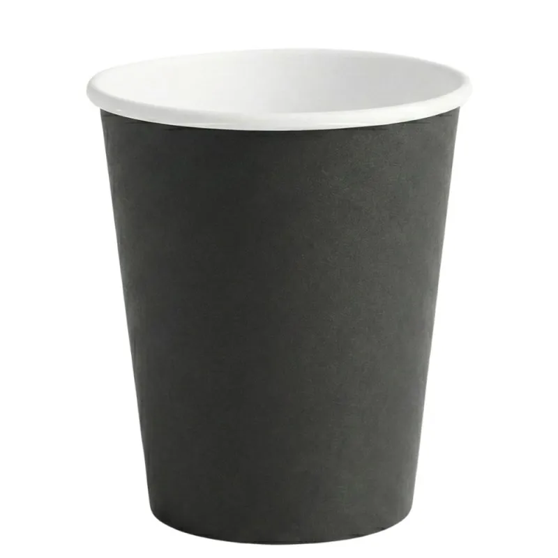 Vasos de cartón negros de 260ml de capacidad. Estos vasos de cartón son ideales para decorar tu fiesta, cumpleaños o cualquier evento y comida donde quieras destacar con originalidad. Unidad de venta en paquetes de 10 unidadades o cajas 1.200 uds.