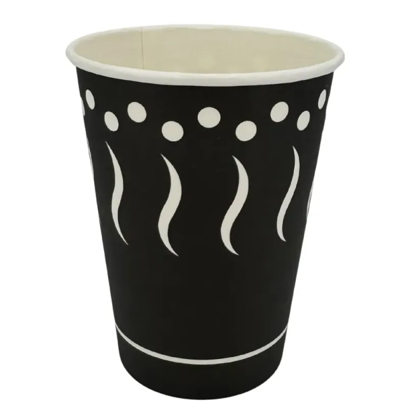 Vaso de cartón negro con diseño Coffee y con capacidad para 360ml para establecimientos comerciales de restauración. Se venden en paquetes de 50 unidades o cajas de 1.000 vasos distribuidos en 20 paquetes. Estos vasos de cartón son compatibles con la tapa drink de Ø9cm.