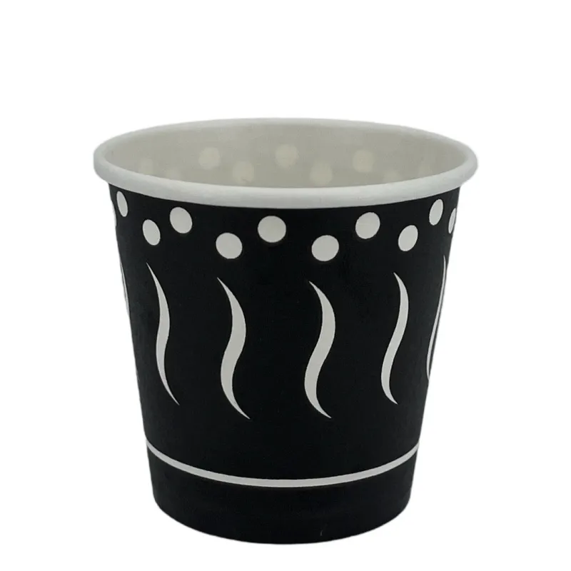 Vasos de cartón negro desechables con capacidad para 120ml. Unidad de venta en paquetes de 50 unidades o cajas de 1.000 Uds distribuidas en 20 paquetes de 50 unidades. Vasos compatibles con la tapa drink de Ø6,2cm.