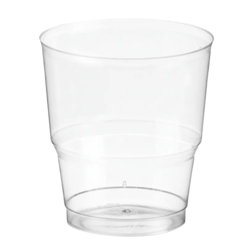 Vasos catering/hotel de plástico inyectado transparentes con capacidad para 220ml. Fabricados en poliestireno alimentario dandole una transparecia perfecta. Unidad de venta en paquetes de 20 unidades o cajas de 500 Uds distribuidas en 25 paquetes de 20 unidades.