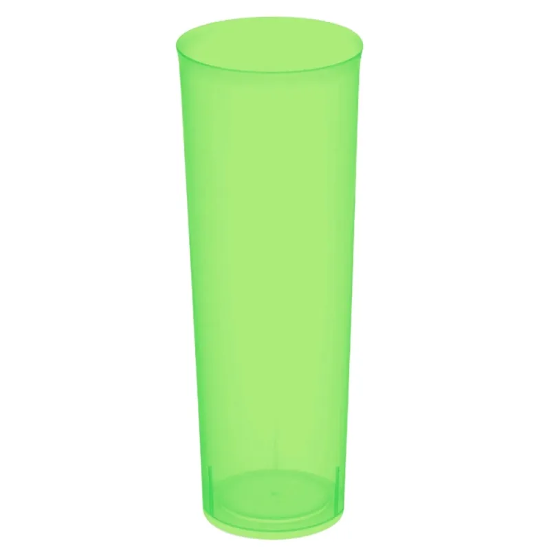 Vasos de tubo plástico desechables inyectado con capacidad para 300ml en color verde flúor. Fabricados en polipropileno alimentario dandole una flexibilidad prácticamente irrompible. Unidad de venta en paquetes de 6 unidades o cajas de 360 Uds distribuidas en 60 paquetes de 6 unidades.