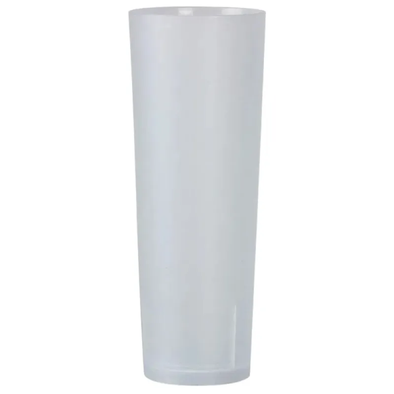 Vasos de tubo en plástico duro reutilizables con capacidad para 330ml. Fabricados en polipropileno alimentario. También llamado Vaso de tubo ecológico de plástico al ser un vaso reutilizable. Unidad de venta en paquetes de 10 unidades o cajas de 420 Uds distribuidas en 42 paquetes de 10 unidades.
