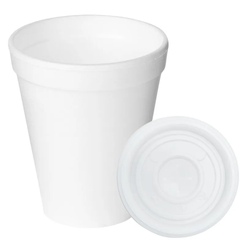 Vasos térmicos con tapas planas con capacidad para 190ml. También conocido como vaso de EPS, vaso de foam o vaso de corcho. Unidad de venta en paquetes de 100 unidades (tapas incluidas) o cajas de 1.000 Uds (tapas incluidas).